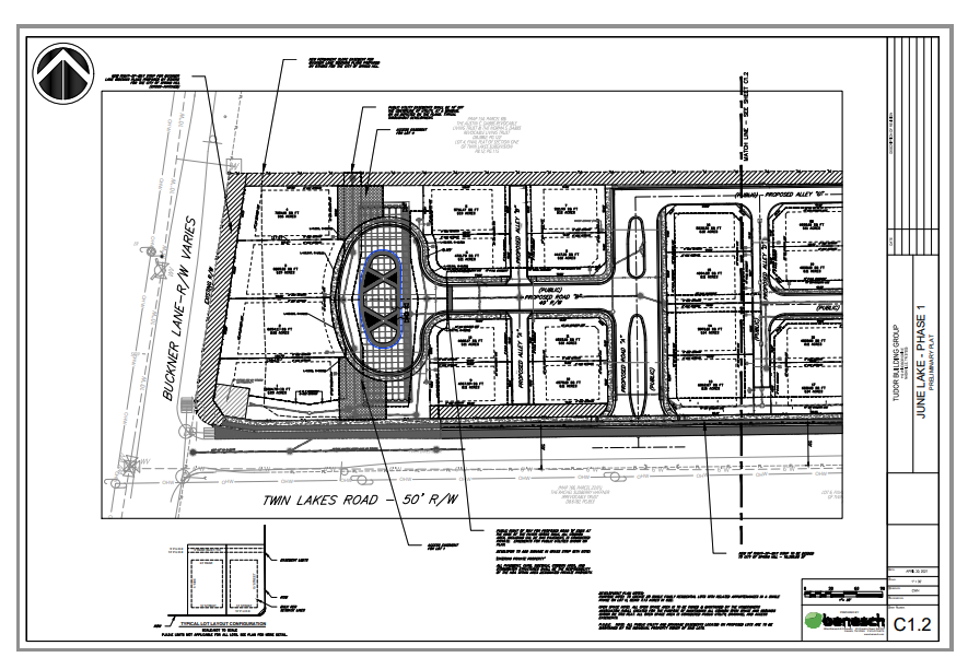 This is the preliminary plat prepared and submitted by Benesch for June Lake Phase 1. This 7.13 acre piece of land that sits at the corner of Buckner Lane and Twin Lakes Drive plans to have 28 single-family home lots. Signature Homes will be the primary builder for this phase.
