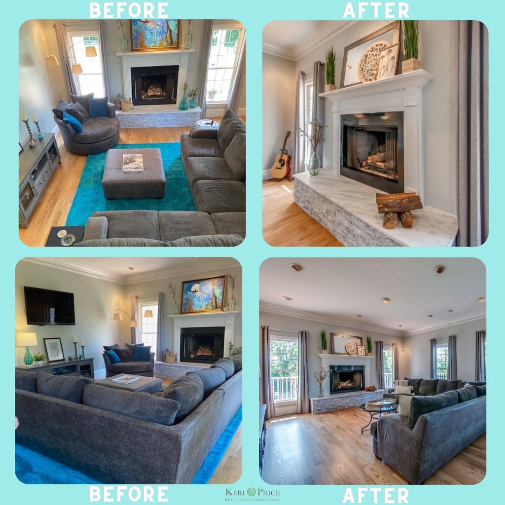 One of my favorite things about working in Real Estate is staging my listings! While I’m NOT a professional home stager, I have spent years working alongside some of the most talented home stagers in Williamson County. These super talented women have taught me the importance of, and how, to make each room in a house look and feel inviting, spacious and memorable. Why do I invest my time and money into doing this for my clients? Well, that’s a no brainer! It’s a proven fact that well staged homes sell much more quickly than the competition AND for considerably more money. And selfishly, I think home staging is more fun than a barrel of monkeys! My stagers and I get to be creative, problem solve and transform houses, room by room, in ways that bring so much joy, pride and happiness to the homeowner and to us! Our barometer for whether or not we successfully staged a home is simply this…. If we and the home owners are excited about how incredible the home looks, once staged, we know buyers are going to love it too! Check out these before and after photos of a living room we staged, in a house in Franklin, TN.
